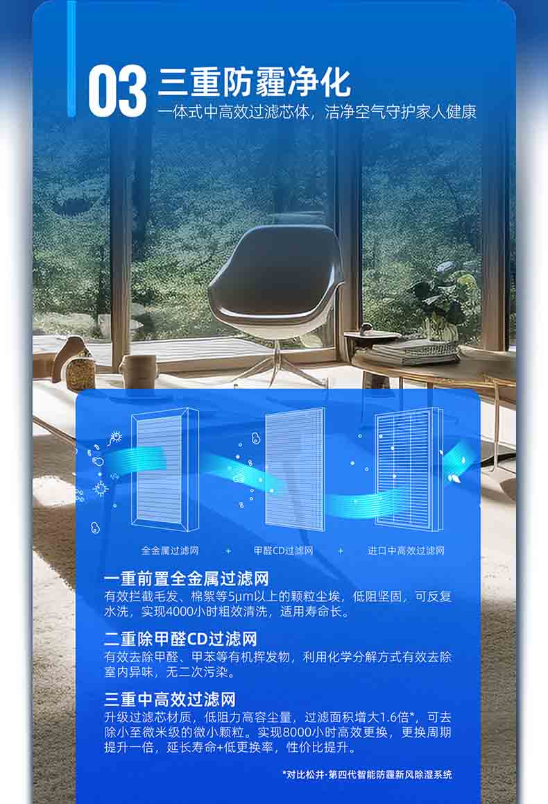 智能防霾、强劲除湿、恒氧新风、三重净化